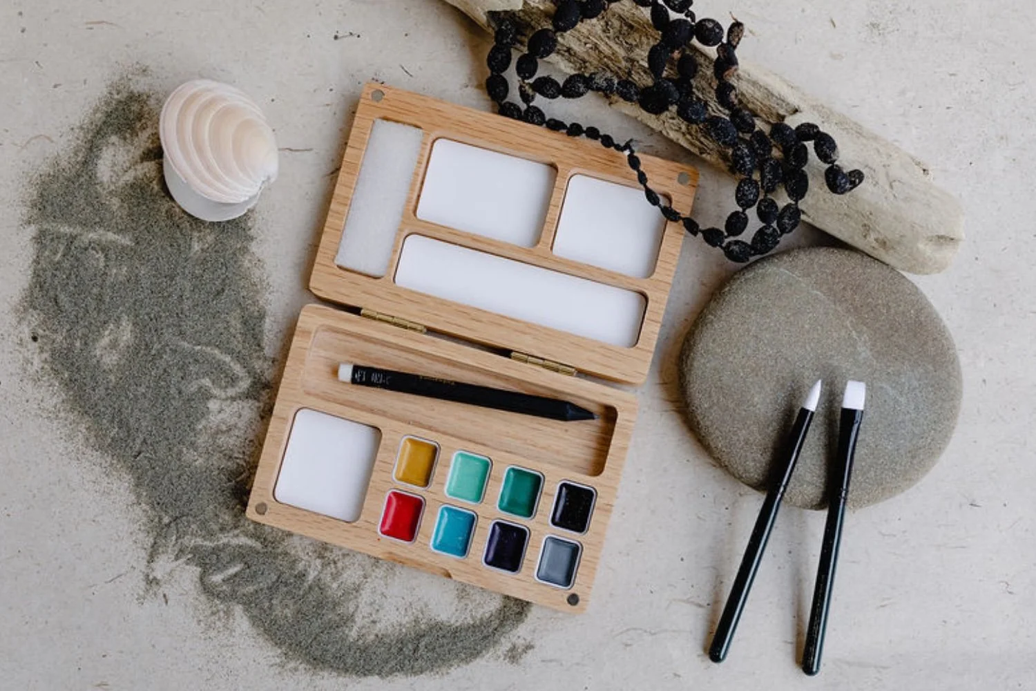 The palette is made from beech wood certified by the Forest Stewardship Council, ensuring durability and longevity during your travels. The paintbrushes are cruelty-free, with synthetic bristles and handles made from birch wood and brass metal. Birch and beech wood trees grow relatively quickly and are often harvested in a way that allows for natural regeneration.